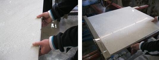 4、适当降低切割速度,建议1,4米/分钟。两手匀速用力将切割机台板向前推动进行切割,待切割片接触点与砖尾部10~20㎜时必须放慢推进速度,控制崩角。在推送过程中,不可两手按压砖,需如下图手法顶住砖使其靠紧定位杆 樱花视频免费观看。